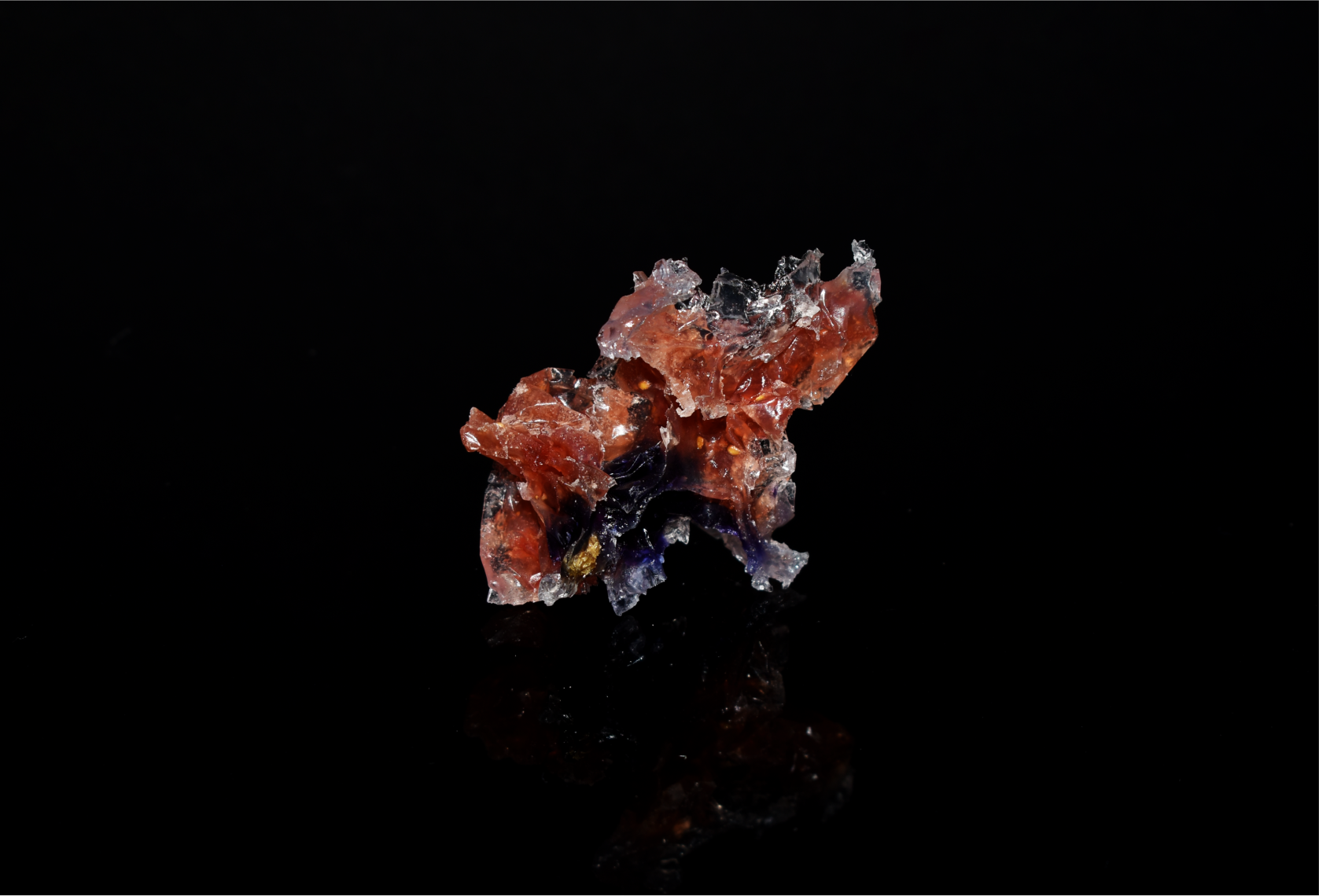 The final piece, “Crystal Mirage”, showcases the natural beauty of blue pea flowers and freeze-dried strawberries in a clear, glass-like structure. The vibrant, irregular fragments and transparent base create a striking, gem-like effect.