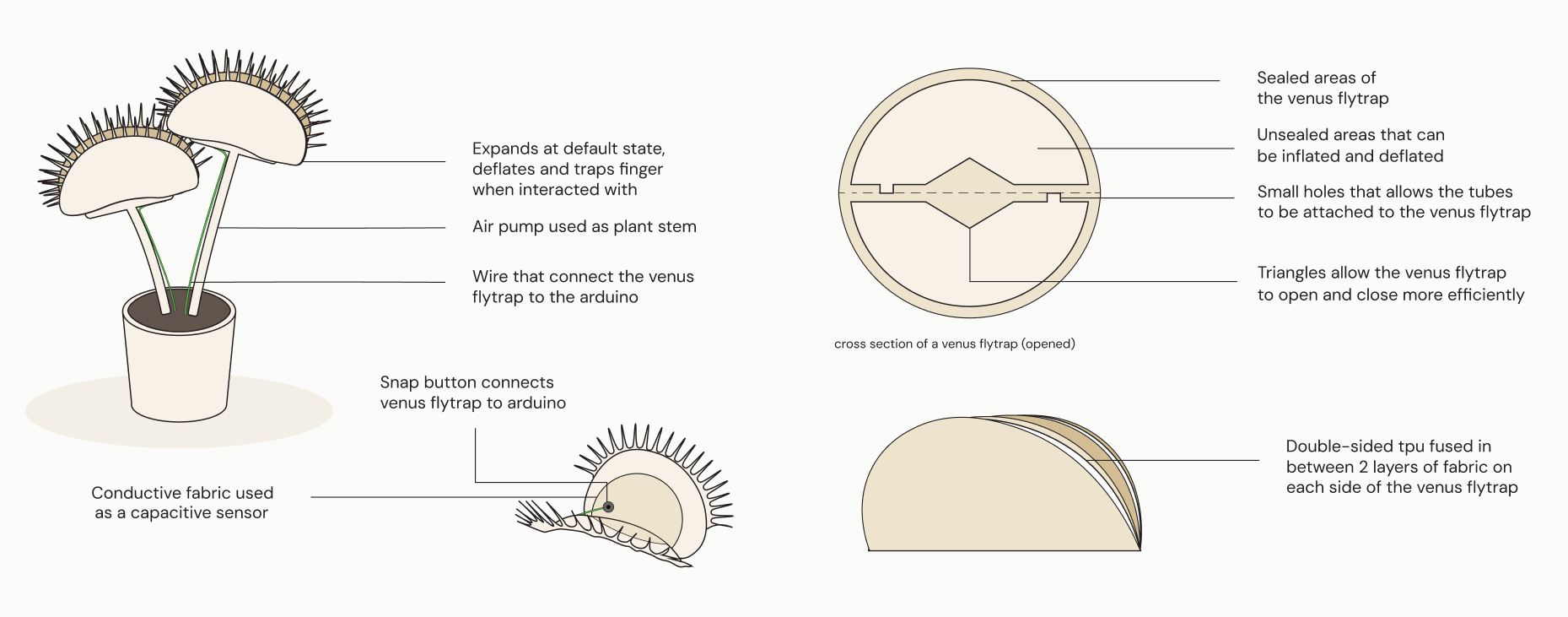 Tap the Trap was part of an actuator exercise exploring how pneumatics can create lifelike motion. Each trap is made from double-sided TPU fused with fabric, forming sealed inflatable chambers with controlled airflow. Triangular folds guide collapse, while conductive fabric acts as a capacitive sensor. Touch triggers the air pump and valves, snapping the trap shut. Baking paper ensures precision during heat-sealing, and wires connect the traps to the pneumatic system for continuous feedback.